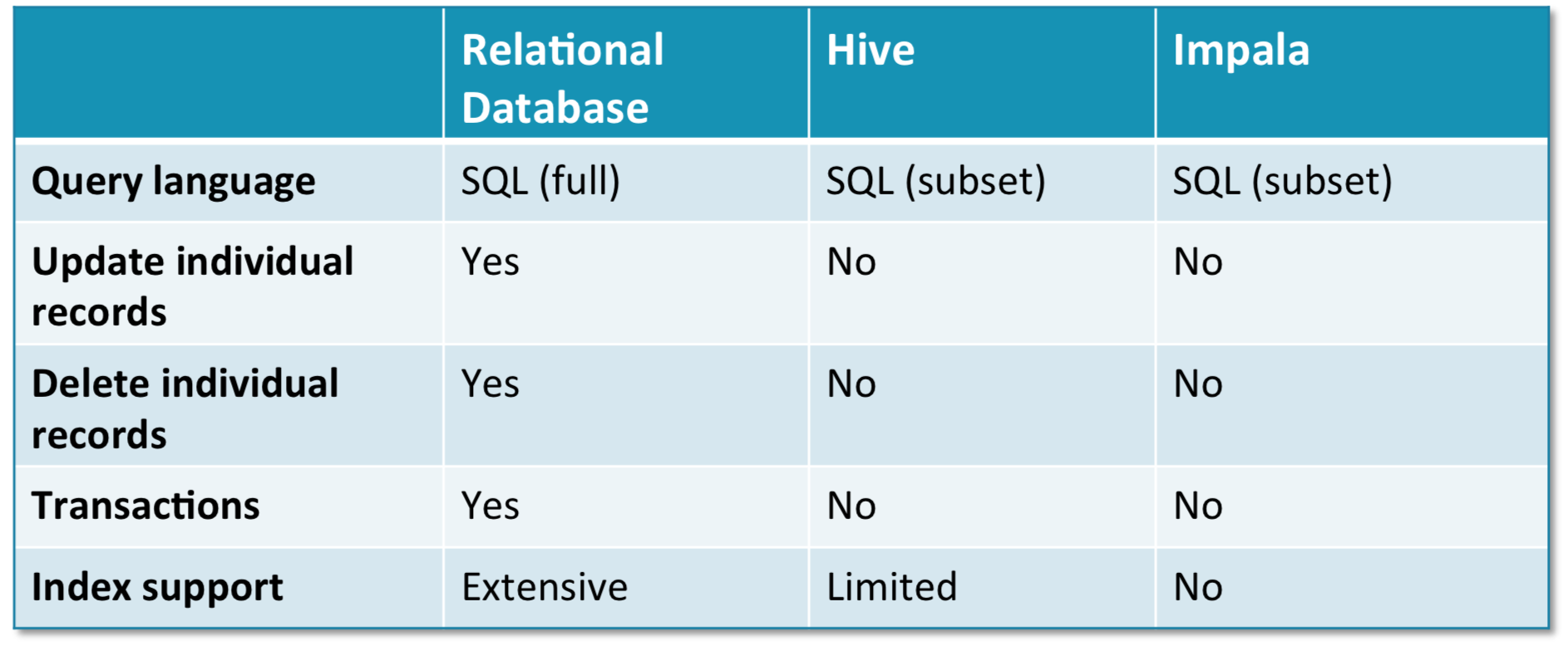 - Impala/Hive 同传统关系型数据库的对比图